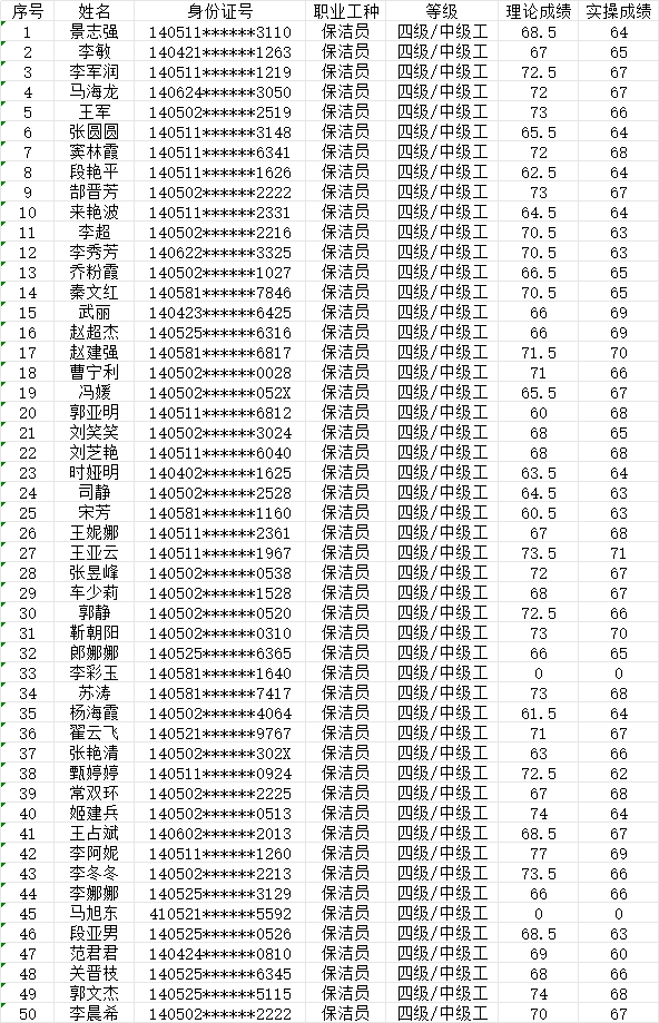 晉城市潔霸清潔服務(wù)股份有限公司職業(yè)技能等級認(rèn)定中心現(xiàn)將2024年1月28日認(rèn)定人員成績公示如下:
